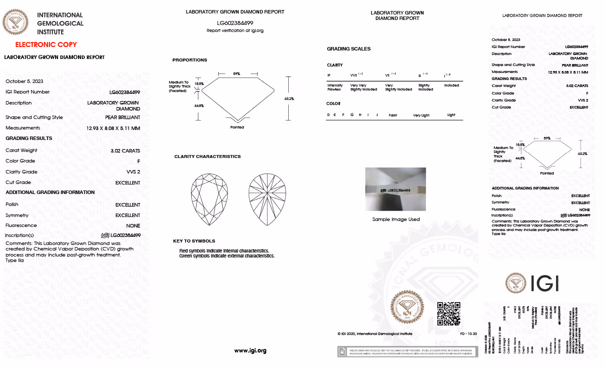 IGI於1975年成立,在全球超過20個城市設有鑑定中心,為全球最大規模、最具有國際認可的寶石鑑定機構之一,深受珠寶品牌與消費者信賴,每一份證書都具備鑽石4C等級、雷射編號、鑑定圖示、防偽標示,讓消費者掌握所購買鑽石的資訊。